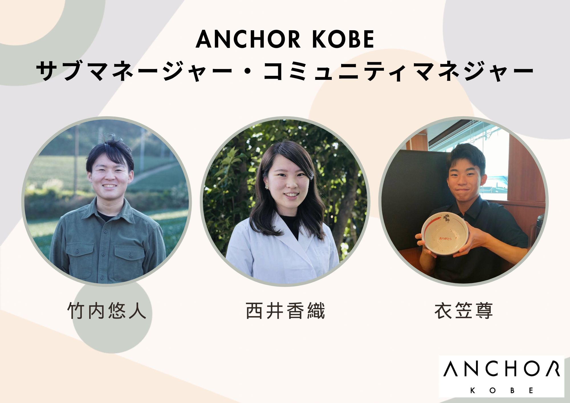 まだ大学1年生で、わからないことだらけです。しかし情熱だけは有り余っています。学生目線だからこそ気づけること、学生だからこそ巻き起こせるエネルギーを大切にしながら、コミュニティマネージャーとしてアンカー神戸に新しい風を吹かせられるよう全力で取り組みます。