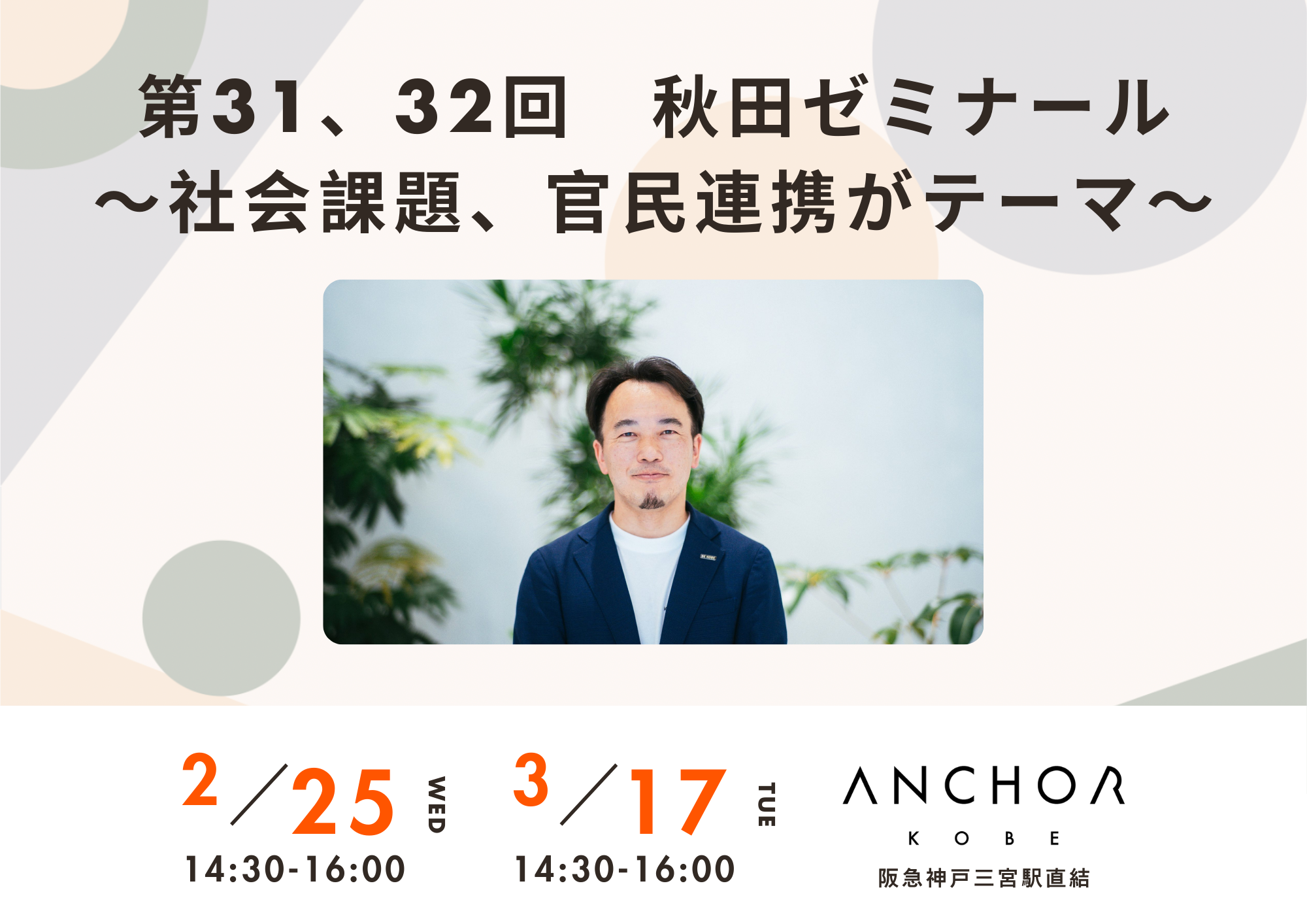 元神戸市職員で社会課題解決コーディネーターの秋田大介さんによる秋田ゼミナールを、第31回は2月25日(水)に、第32回は3月17日(火)に開催します。