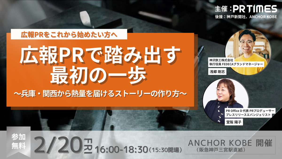 プレスリリース配信サービスを運営する株式会社PR TIMESは「広報PRで踏み出す最初の一歩~兵庫・関西から熱量を届けるストーリーの作り方」セミナー(参加無料)を開催します。
