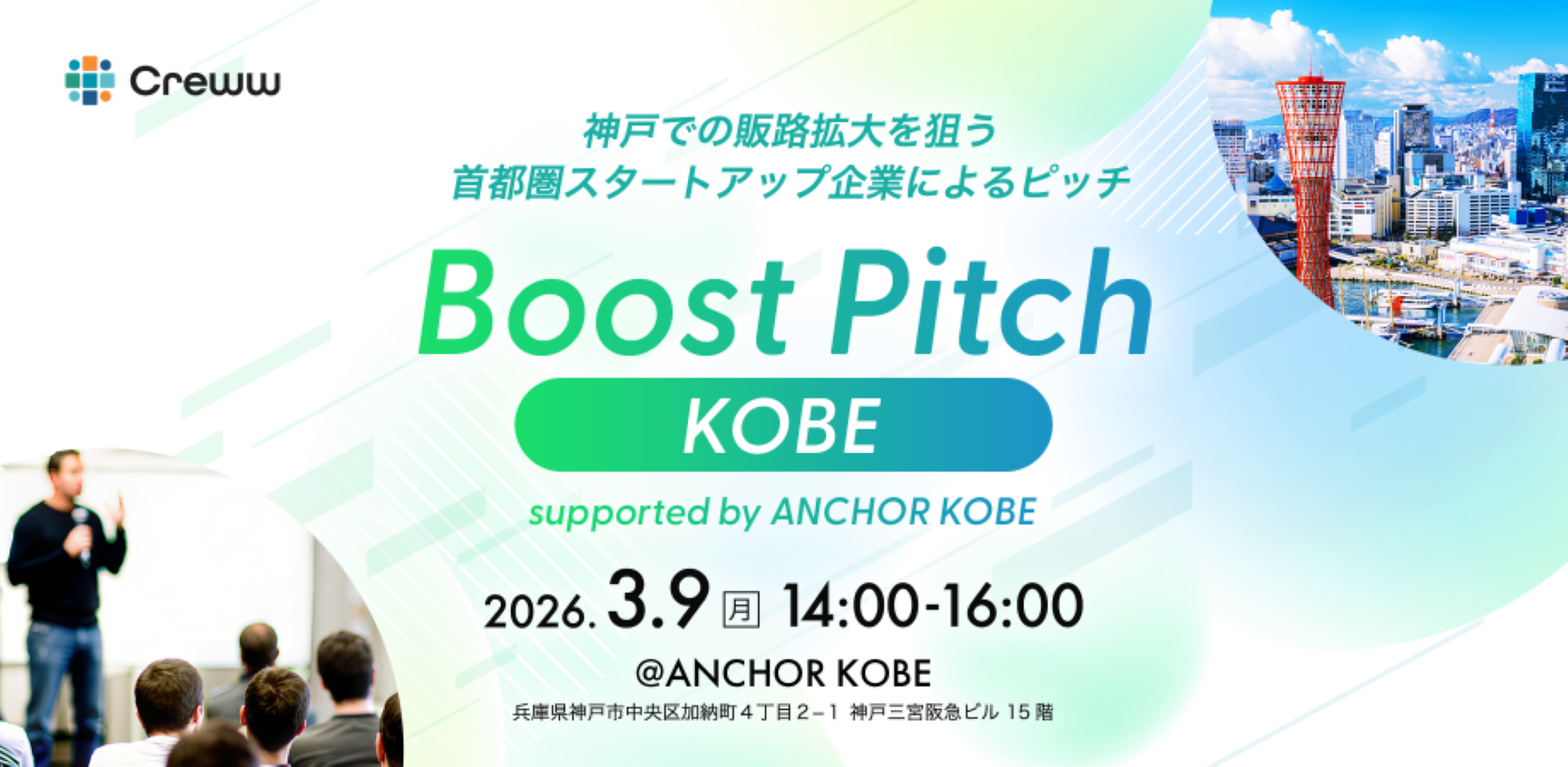 国内最大級のオープンイノベーションプラットフォームを有し、共創によるスタートアップ支援に取り組んできたCreww株式会社と、神戸市のアイコンとなるインキュベーション施設ANCHOR KOBEの共催イベントです。