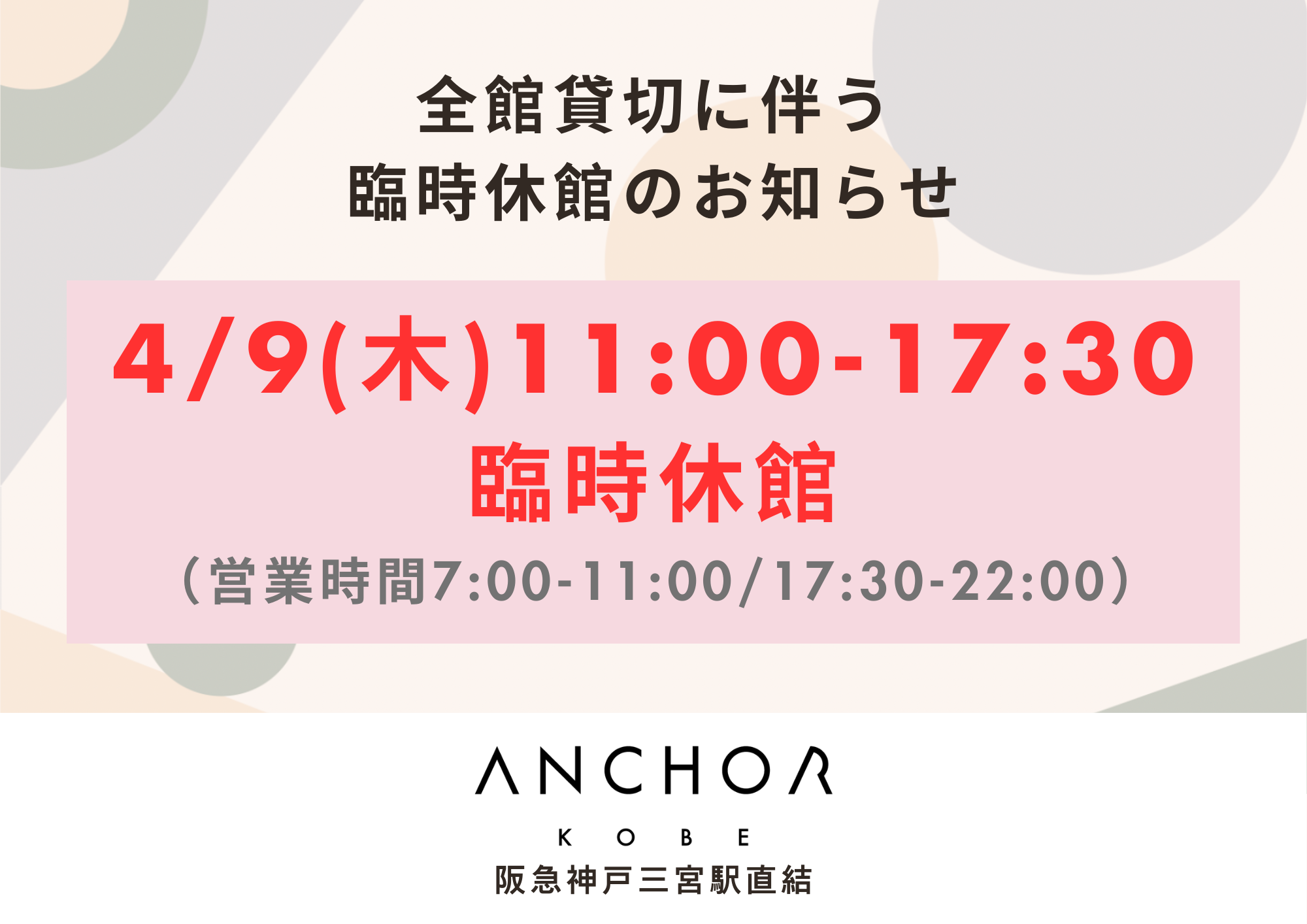 アンカー神戸は下記日程においては全館貸切となるため、臨時休館とさせていただきます。