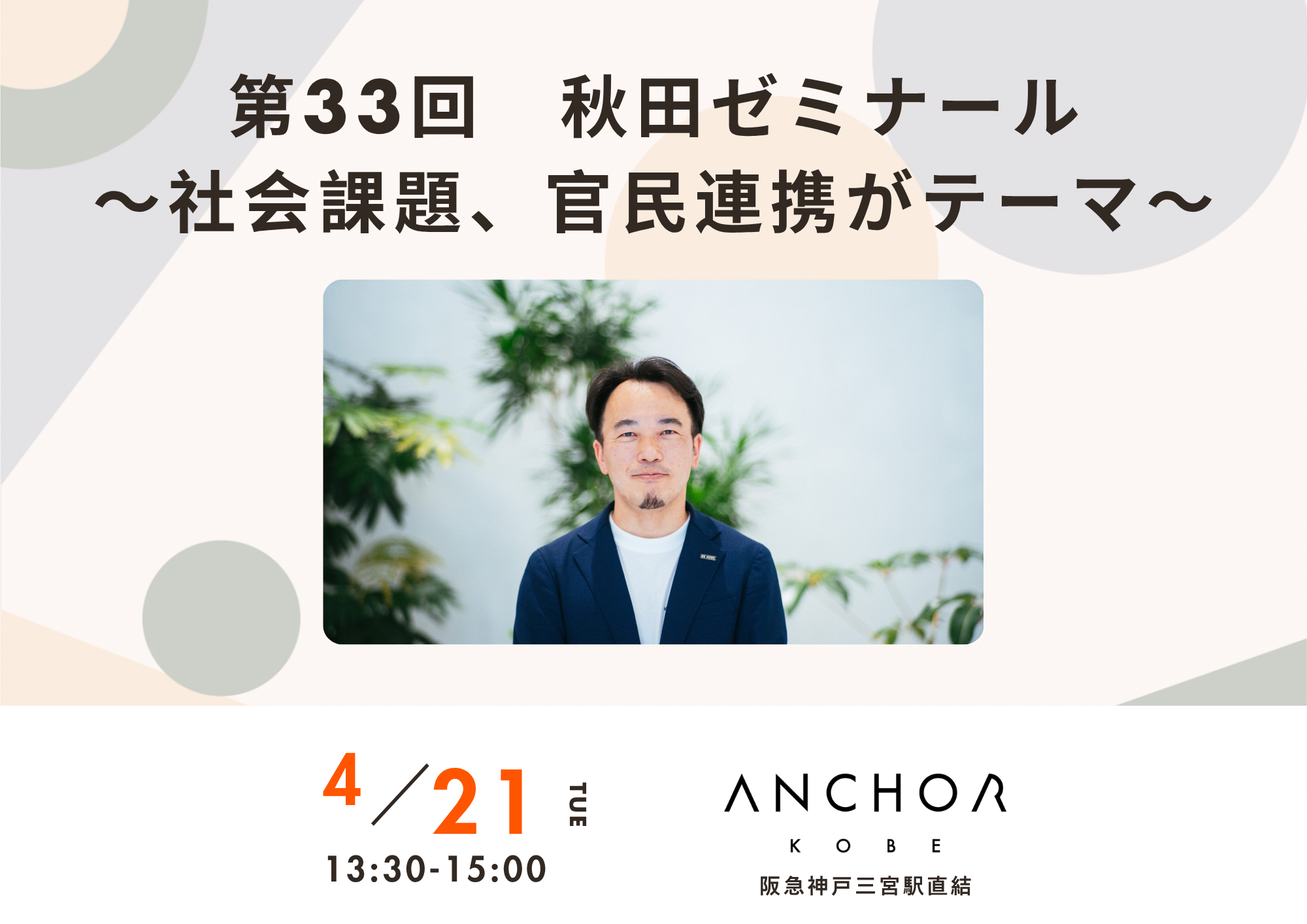 元神戸市職員で社会課題解決コーディネーターの秋田大介さんによる秋田ゼミナール。第33回は4月21日(火)13:30-15:00に開催します。